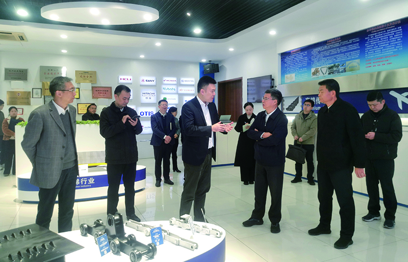 在东华链条展厅,调研组观看了企业宣传片,并参观了配套于各行业的高端链传动产品。宣成向调研组详细介绍了东华链条的全球研发制造布局、国内外市场拓展、智能制造、精细化管理、人才队伍建设以及未来发展规划。