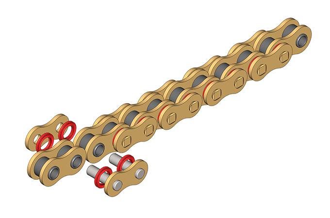 ● 摩托车链主要有摩托车发动机链、摩托车驱动链(包含O形密封圈摩托车链、X形密封圈摩托车链); ● 摩托车发动机链条通过优化设计,链板采用等温热处理、销轴表面特殊硬化处理,产品具有高疲劳强度、高抗磨损性能等特点; ● 摩托车密封圈链条采用优质的材料和润滑油脂、先进的加工工艺,产品具有高疲劳强度、高抗磨损性能等特点,以满足不同排量、不同用途的摩托车使用需求,广泛应用于各类摩托车赛事以及公路使用摩托车。